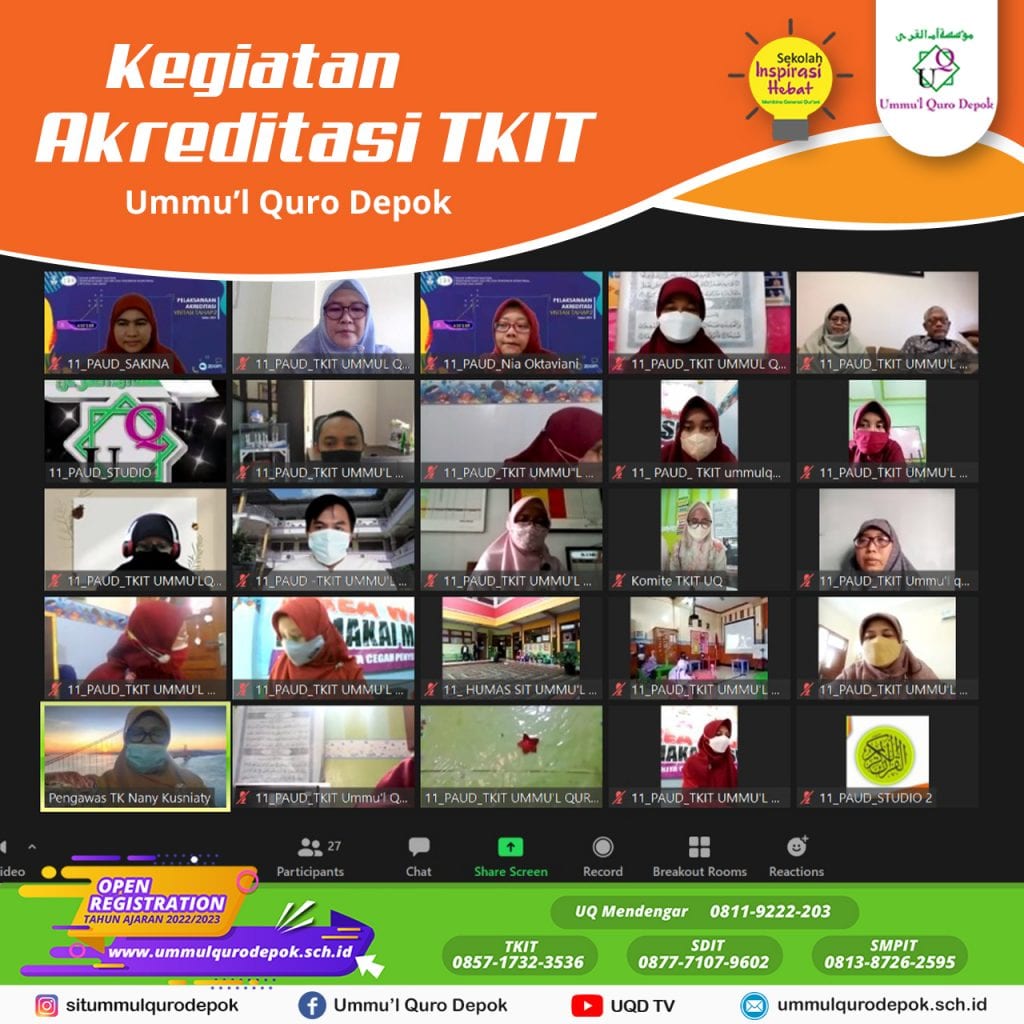 Senin,25 Oktober 2021. UQ News, Alhamdulillah telah dilaksanakan Akreditasi visitasi secara daring pada hari Jum’at, 22 Oktober 2021. Kegiatan ceremony dengan di hadiri oleh Dewan Pembina dan Dewan Pengurus Yayasan Ummu’l Quro Depok. Serta Pimpinan Harian serta seluruh kepala Bagian berjalan dengan lancar. Adapun Tim Asesor BAN PAUD Jawa Barat Yaitu, Ibu Sakina,S.Pd Ibu Nia […]