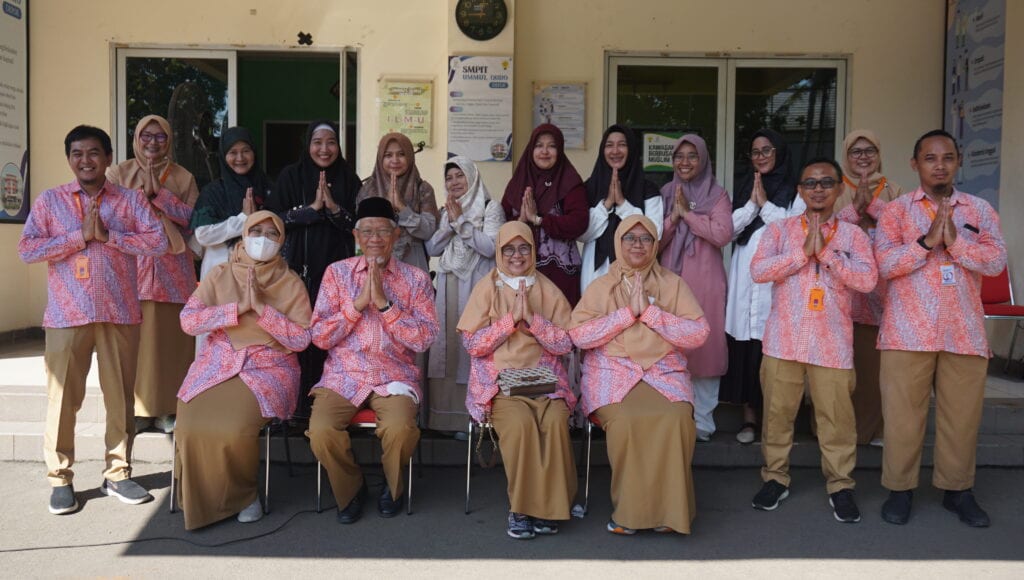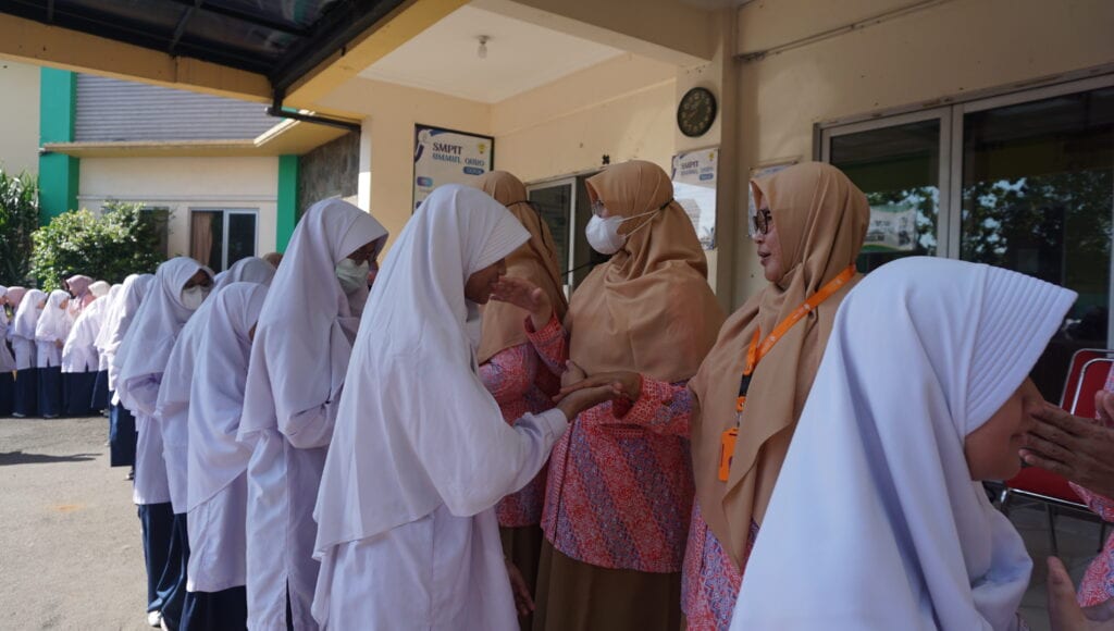 Dewan Pembina Yayasan, Ustadz Ali Fikri, Lc.,M.A. bersalam-salaman dengan seluruh siswa, guru dan pegawai SIT Ummu’l Quro Depok