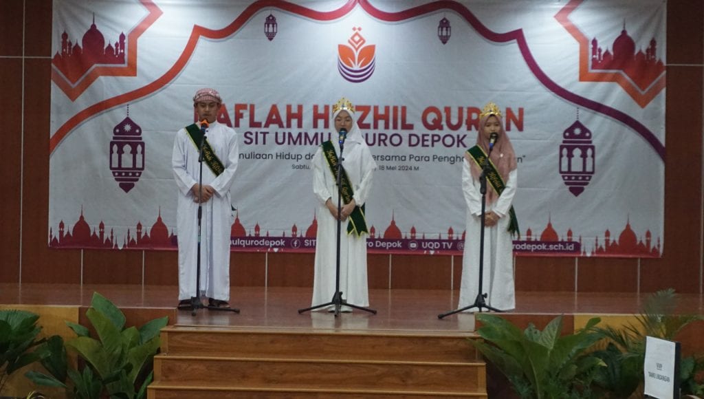 SIT Ummu’l Quro Depok kembali menyelenggarakan Haflah Hifdzil Quran pada Sabtu (18/5). Perhelatan akbar tersebut diikuti oleh siswa siswi dari tingkat TKIT, SDIT dan SMPIT. Pagelaran akbar yang bertajuk “Meraih Kemuliaan Hidup dan Syafa’at Bersama para Penghafal Al Qur’an” ini, dihadiri oleh Ustadz KH. Ali Fikri, Lc, M.A selaku Dewan Pembina Yayasan Ummu’l Quro Depok, pada kesempatan tersebut disela sambutannya beliau mengapresiasi secara langsung kepada 283 siswa/i penghafal Al-Qur’an yang terdiri dari 52 siswa/i TKIT, 90 siswa/i SDIT, dan 141 siswa/i SMPIT Ummul Quro Depok.